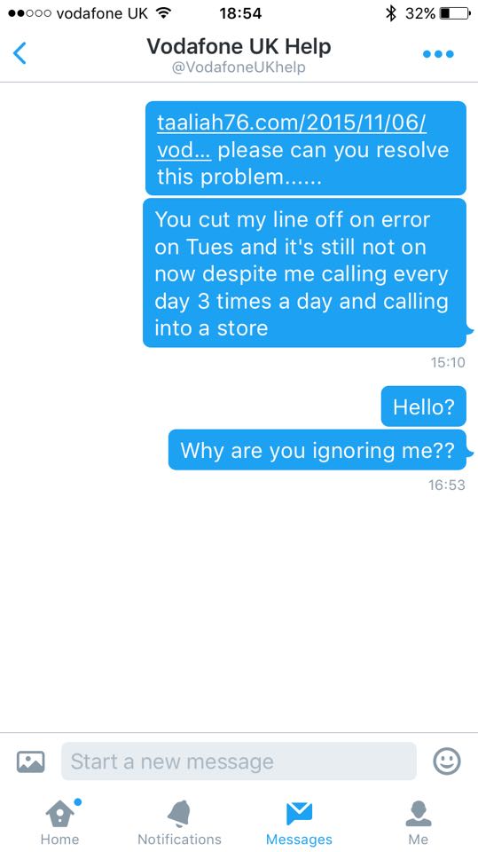 Meanwhile, over on Twitter, it appears that @VodafoneUKhelp want to anything but help and have taken to totally ignoring me. Despite following me on Tuesday and tweeting to ask that I ‘DM’ (direct message) them my issue, they have refused to interact with any of my numerous tweets tagging them as well as all of my ‘DM’s’…..