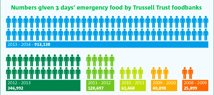 The Trussell Trust are opening foodbanks at a rate of two a week. Their figures reveal that the number  of people they gave emergency food to rose from almost 350,000 in 2012/13 to over double at 900,000 in 20013/14. If this is the tip of the iceberg, as both the figures and Dr Purdam’s research support, then we have a huge problem and it is only going to get worse – it’s estimated that 4.7million people in the UK live in food poverty and the Trussell Trust predict there will be more than one million people using their foodbanks in 2014 alone.